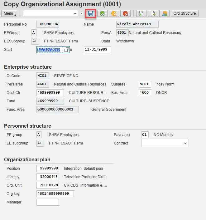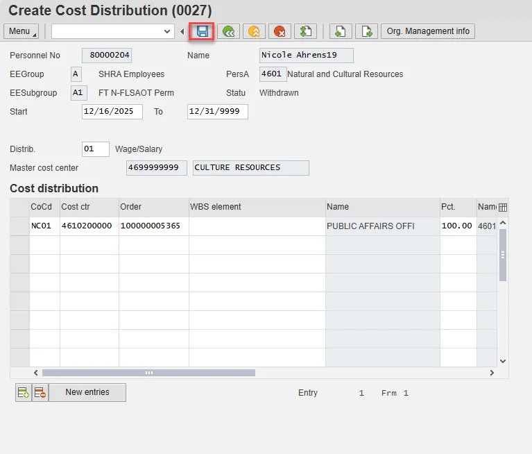 Step 17. The information on Create Cost Distribution (0027) is copied from IT1018 automatically. No entry is required here. This information is required for Payroll to have the necessary information if they need to generate a check after the employee has separated. Even though the system defaults the entry from IT1018, it is critical that you save the infotype again.