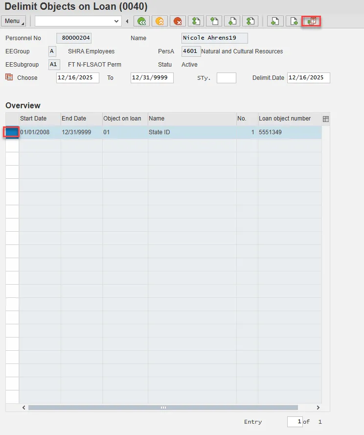 Step 22. On the Delimit Related Experience (9822) screen, choose the gray box next to the current (12/31/99) line item. Select the Delimit button.