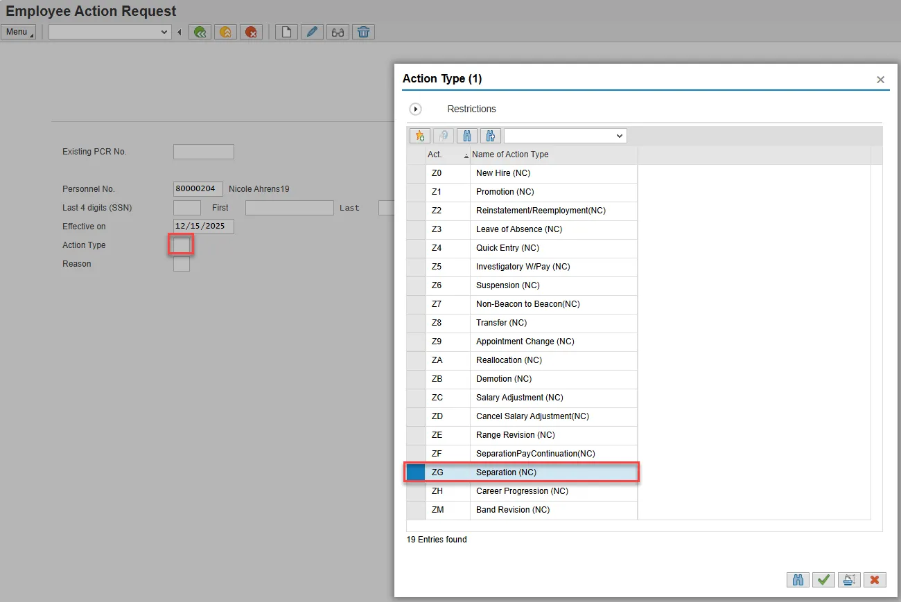 Step 4. Select the Action Type field and access the matchcode. Double click Separation (NC) from the list.