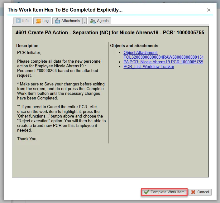 Only choose Complete Work Item if you have completed all steps of the Separation process, including additional payout types if appropriate. This will mark the Separation PCR as complete.