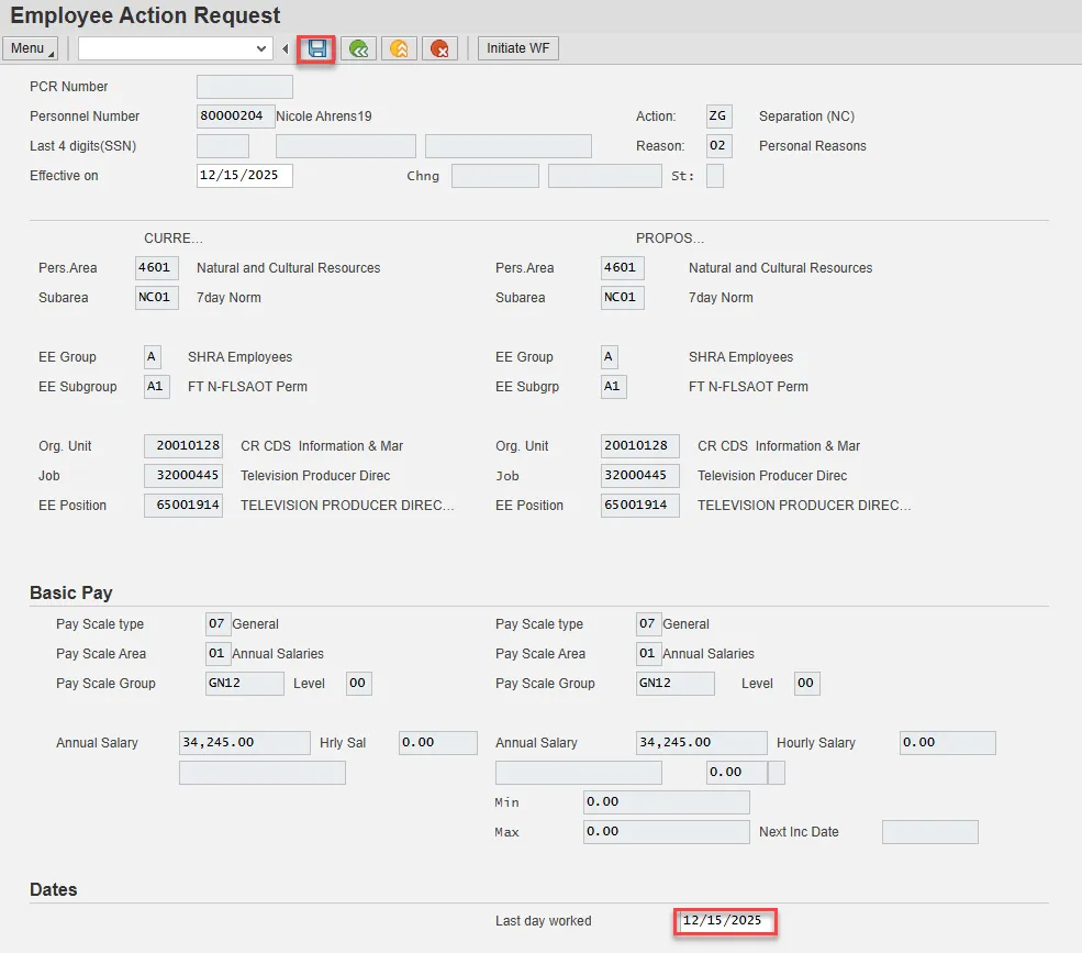 Note: Do not change the EE Position field to 99999999. The system will change it within the processing of the action after it has been approved.