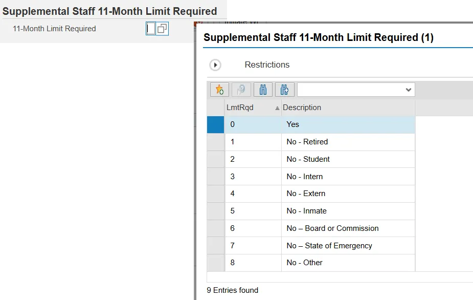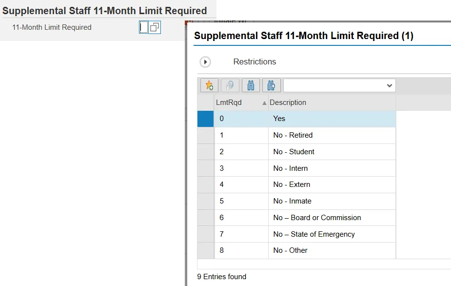 Step 2. Click in the box beside 11-Month Limit Required? to access the list of Supplemental Staff 11-Month Limit Required 9 Entries.