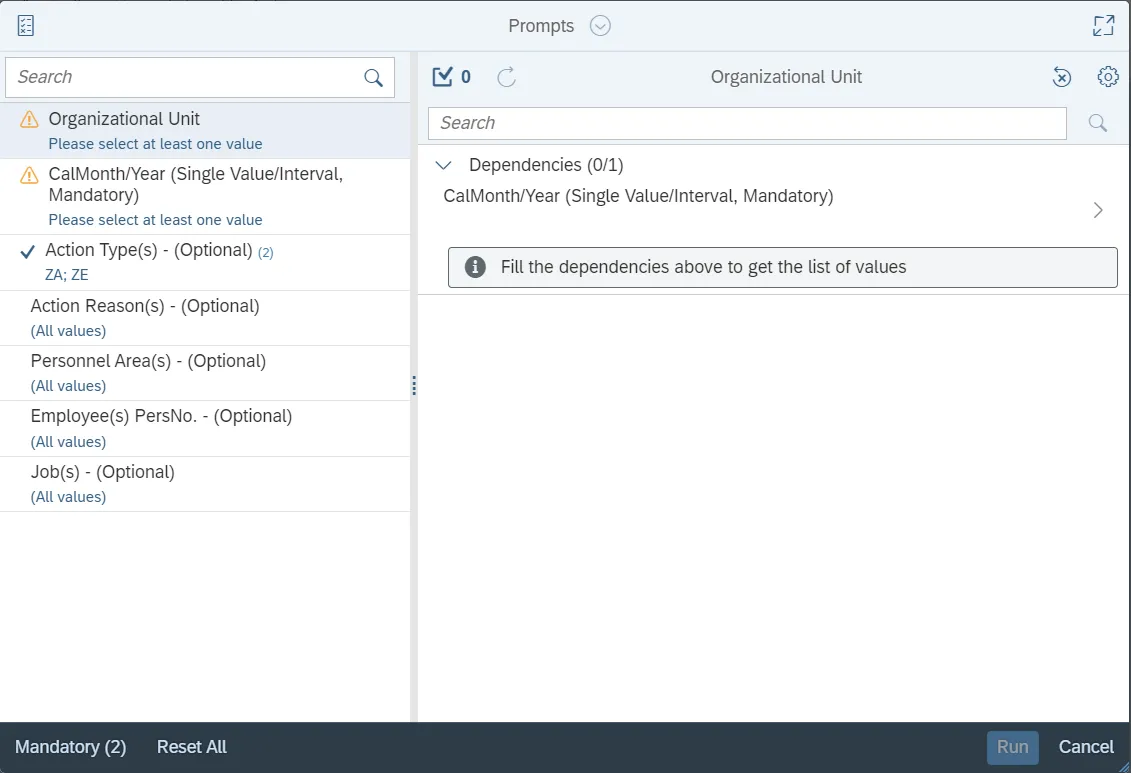 This report is generated after selecting values for the mandatory prompts. All mandatory prompts must have values selected before the Run Icon can be used to generate the report. Mandatory prompts can be identified as mandatory by the exclamation mark inside of the yellow-orange triangle, the square with the checkmark, or the display of (Mandatory). Detailed instructions for interaction with each prompt can be found on the Web Intelligence Prompt List on the OSC website.