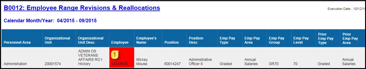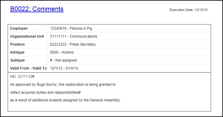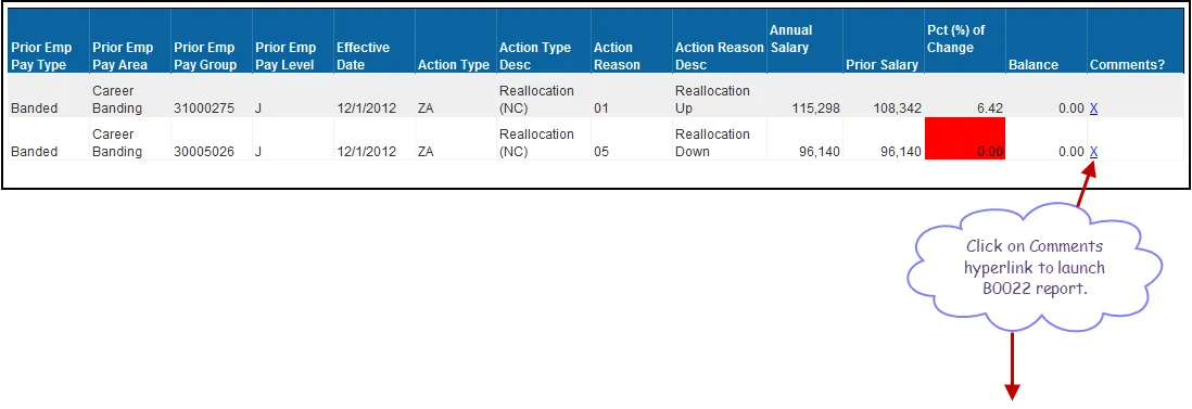 This report lists employees who have received a Range Revision or Reallocation and shows if there is a balance. Provides jump to ‘B0022: Comments’ report.
