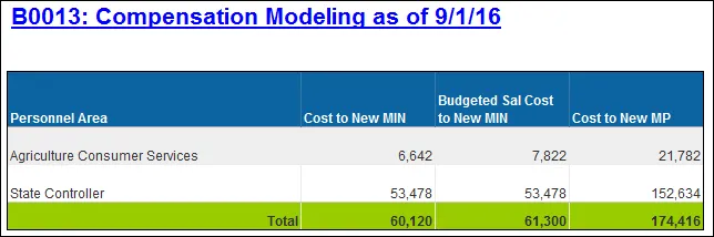 B0013 Compensation Modeling (1st tab): This tab lists the total Cost to New MIN, Budget Cost to New MIN, and Cost to New MP for each agency. Below is a sample rendering.