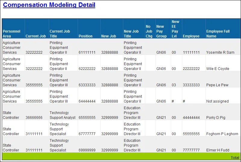 Compensation Modeling Detail (2nd tab): This tab lists all Positions, Employee, New Job, and corresponding costs to bring employees or positions to New Job Minimum or New Job MP (midpoint). Below is a sample rendering.