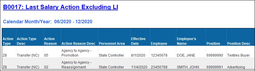 The last salary action selected represents the most recent action based on the date range used when executing the report.