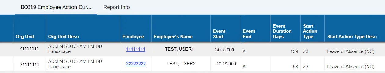 This report captures action pairs that are expected to have a finite duration. The report will calculate and display the true duration of paired actions to determine how long an employee has been in an action state such as Leave of Absence (LOA) or Acting Promotion.