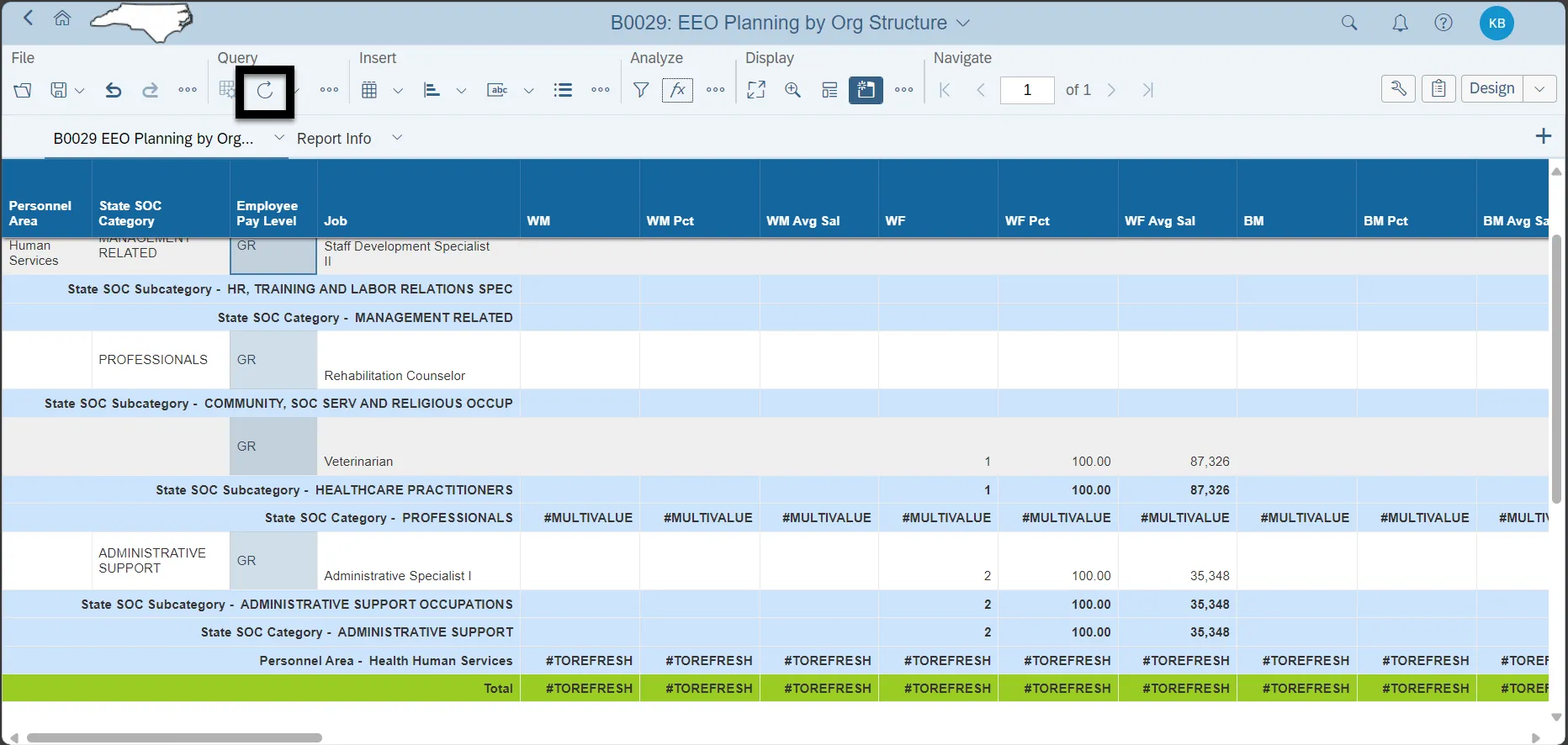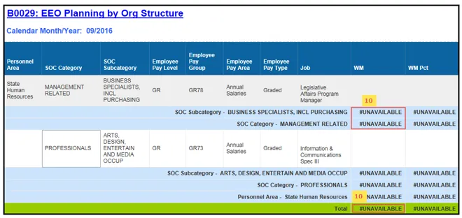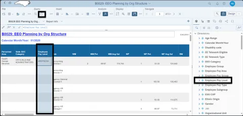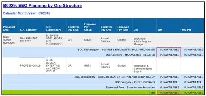 EEO Planning by Org Structure: This report provides demographic Information such as ethnic origin and gender along with EEO and State SOC Categories. The report displays organizational structure data by Personnel Area, State SOC Category, State SOC Subcategory, and Job.