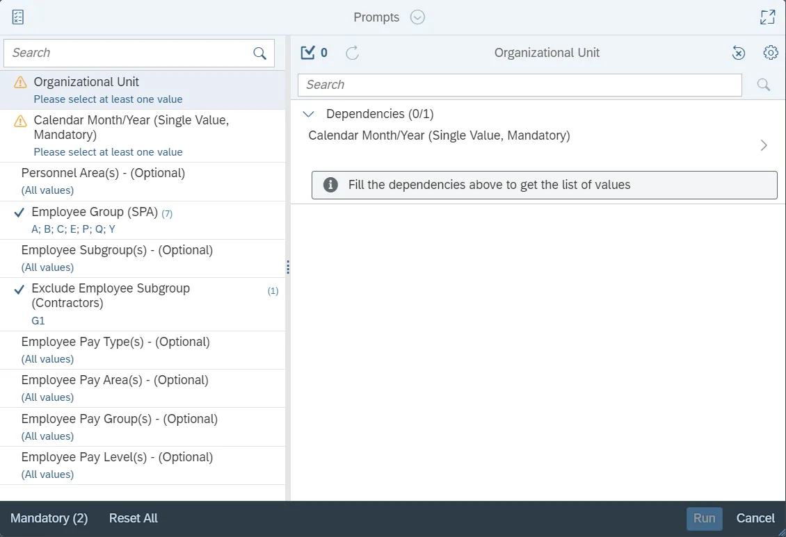 This report is generated after selecting values for the mandatory prompts. All mandatory prompts must have values selected before the Run Icon can be used to generate the report. Mandatory prompts can be identified as mandatory by the exclamation mark inside of the yellow-orange triangle, the square with the checkmark, or the display of (Mandatory). Detailed instructions for interaction with each prompt can be found on the Web Intelligence Prompt List on the OSC website.