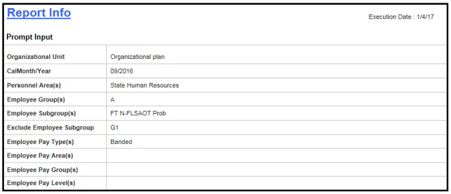 This report provides demographic information such as ethnic origin and gender along with EEO and State SOC Categories. The report displays organizational structure data by Personnel Area, State SOC Category, State SOC Subcategory and Job.