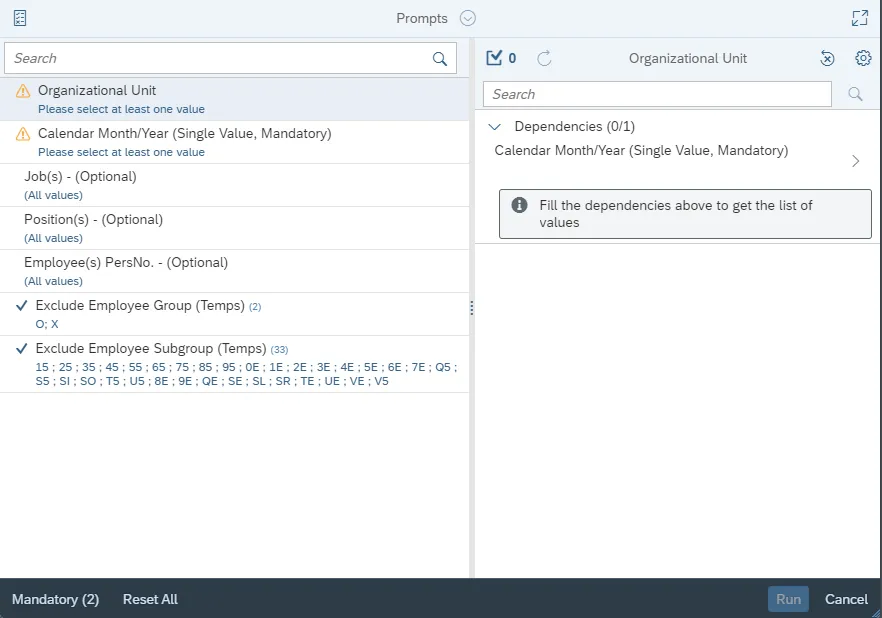 This report is generated after selecting values for the mandatory prompts. All mandatory prompts must have values selected before the Run Icon can be used to generate the report. Mandatory prompts can be identified as mandatory by the exclamation mark inside of the yellow-orange triangle, the square with the checkmark, or the display of (Mandatory). Detailed instructions for interaction with each prompt can be found on the Web Intelligence Prompt List on the OSC website.