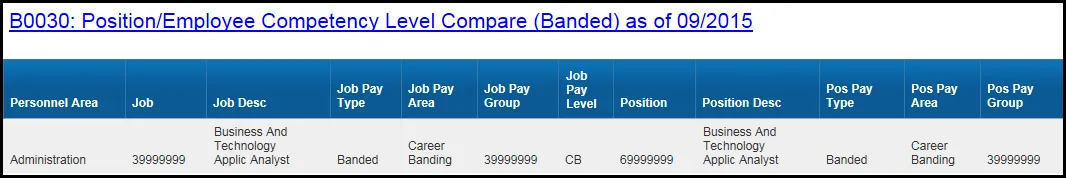 This report is used to compare the Competency Level settings on Employee and Position for Banded pay types so that corrective action may be taken when discrepancies are found.