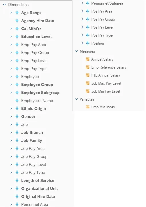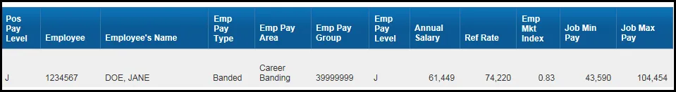 This report shows the Competency (Pay Level) settings along with other relevant Pay attributes for Employee, Job, and Position for Banded Pay Types.
