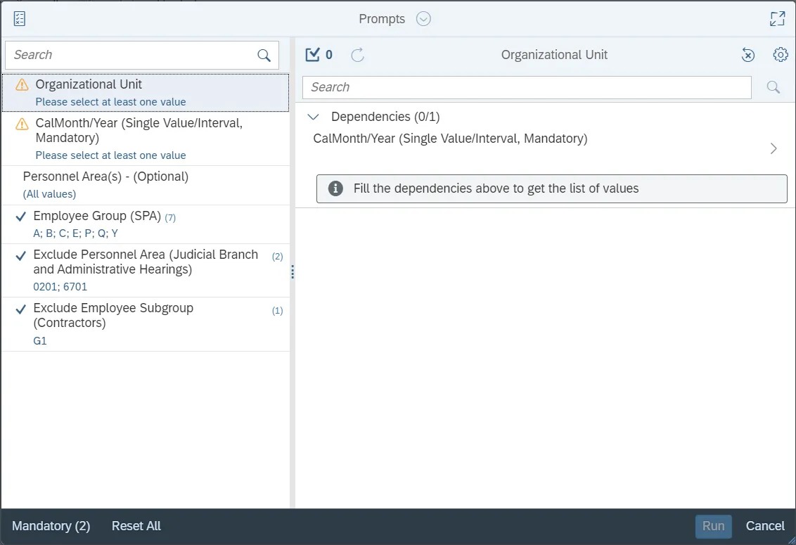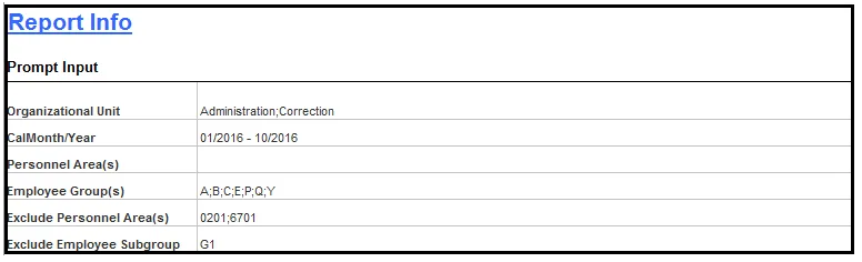 - By default, Personnel Areas ‘Judicial Branch’ and ‘Administrative Hearings’ are excluded in the report, and this can be changed. Please refer Exclude Personnel Area (Judicial Branch and Administrative Hearings) in Exclusion Prompts to remove the default values.