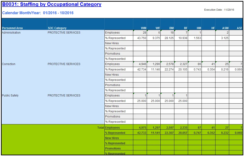 - The report is used to make comparisons by Personnel Area, SOC Category, Employees, New Hires and Promotions.