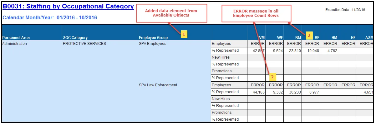 - The below #ERROR message will appear in all Employee count rows when any data elements from Available Objects are added.