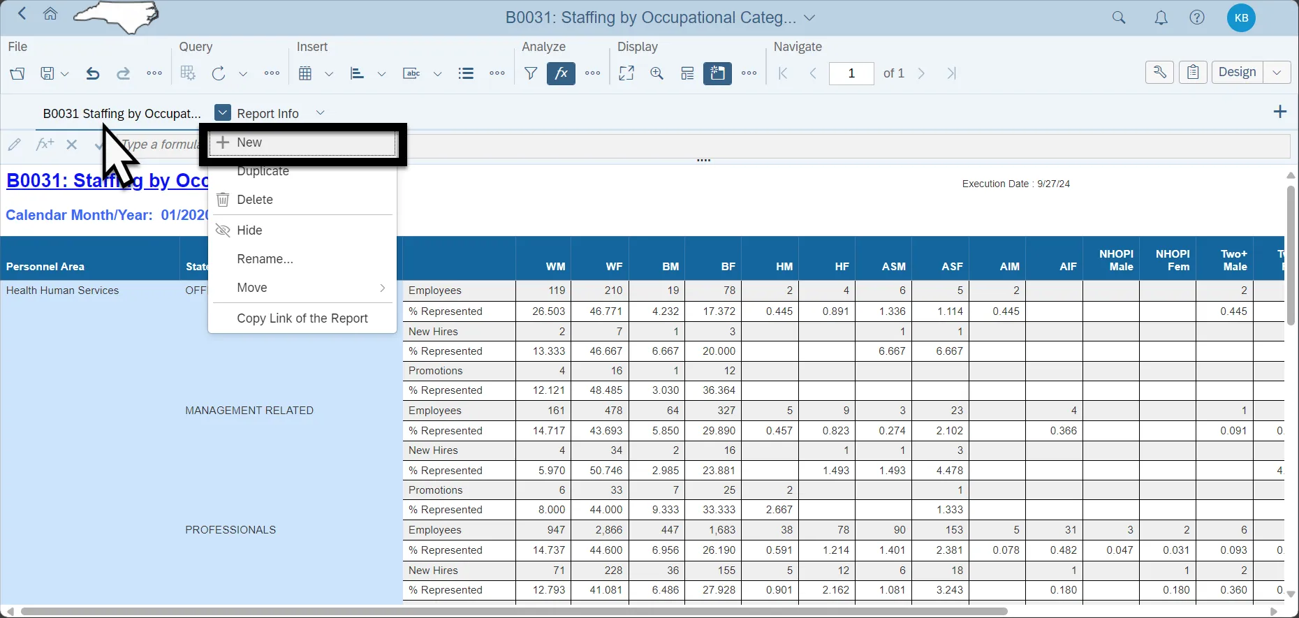- Right-Mouse click on the reporting tab ‘B0031 Staffing by Occupational Category.