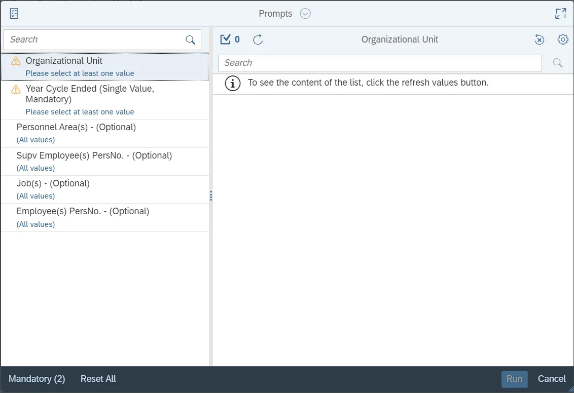 This report is generated after selecting values for the mandatory prompts. All mandatory prompts must have values selected before the Run Icon can be used to generate the report. Mandatory prompts can be identified as mandatory by the exclamation mark inside of the yellow-orange triangle, the square with the checkmark, or the display of (Mandatory). Detailed instructions for interaction with each prompt can be found on the Web Intelligence Prompt List on the OSC website.