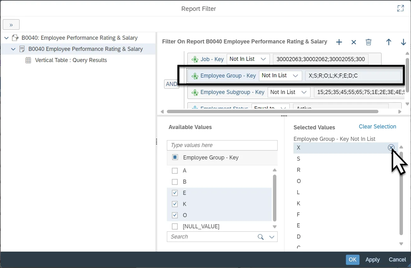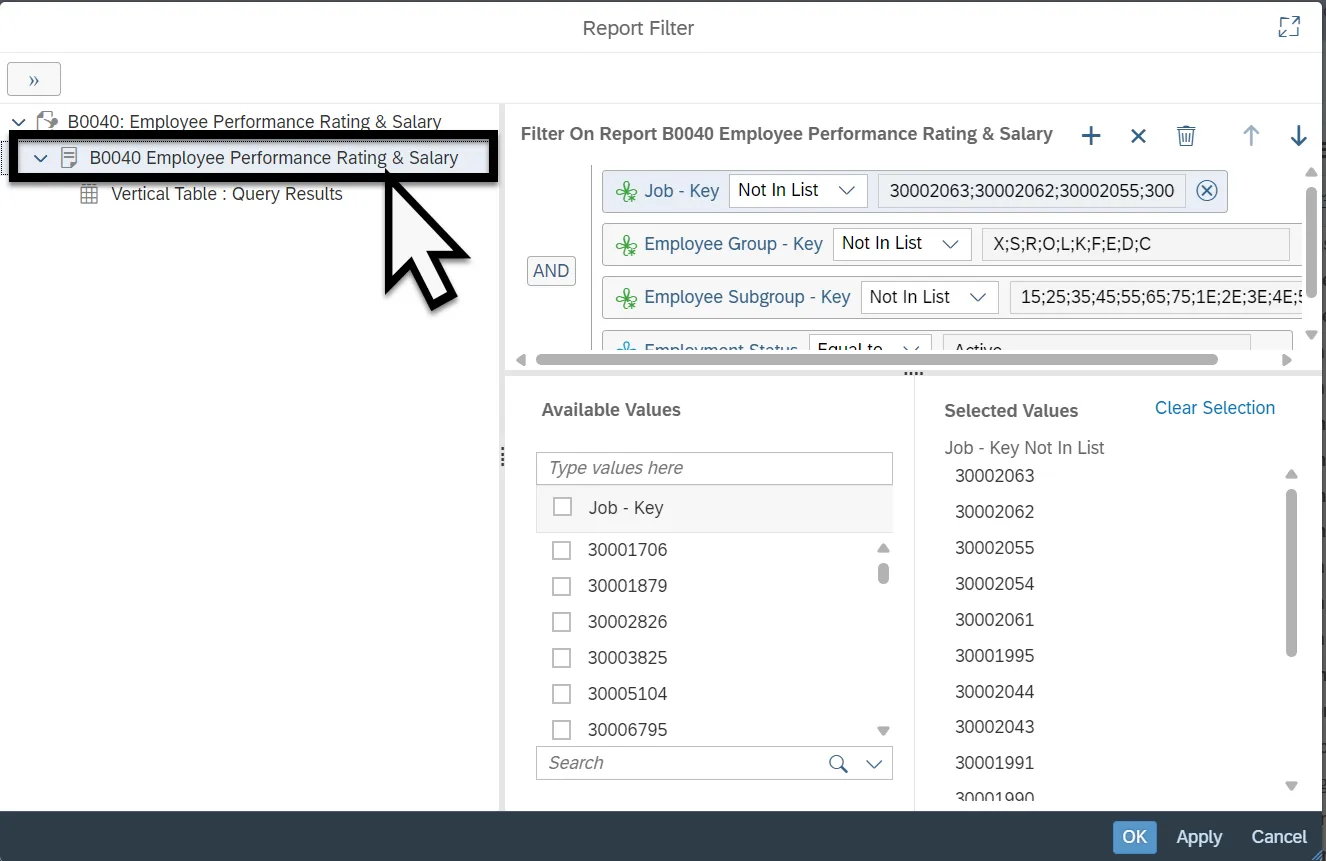 Step 1 - Click the “Employee Group– Key” filter to see the jobs that are excluded from the report