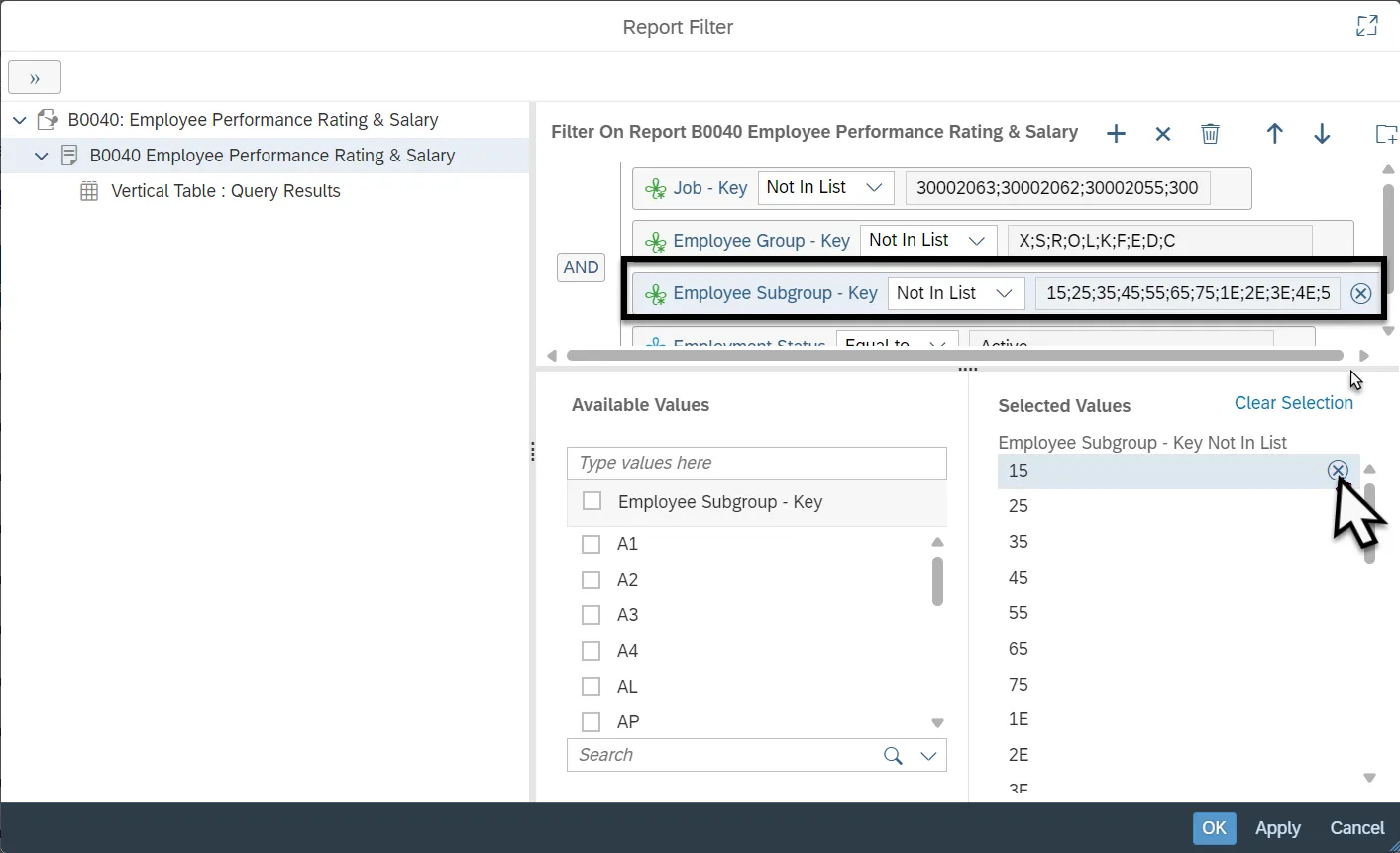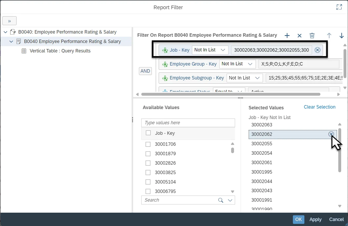 - This report contains filters that exclude specific jobs, employee groups and employee subgroups.