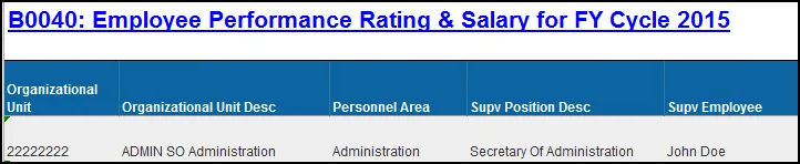 The B0040: Employee Performance Rating & Salary report provides a list of active employees within the organizational unit selected, along with each employee’s performance rating and salary as of the end of the year cycle selected.