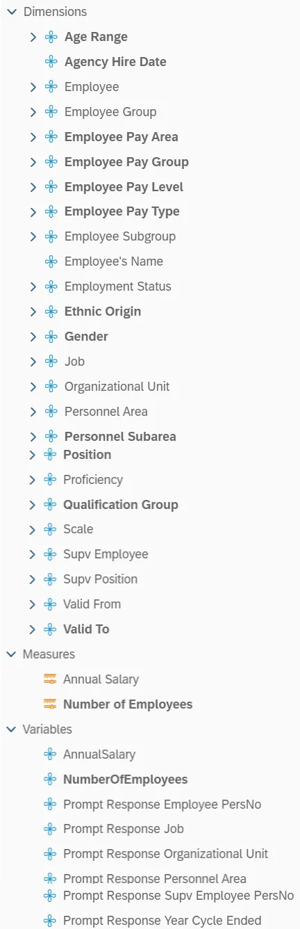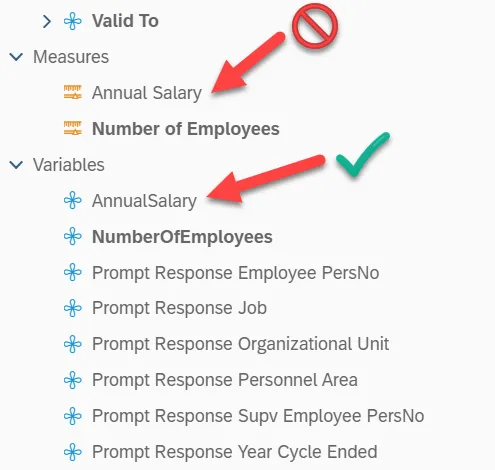 - The annual salary on the base report is a variable named “AnnualSalary”. If you remove this variable from the report, and later decide that you need it, you will need to add the variable named “AnnualSalary” (shown with the check mark below). Do not use the measure named “Annual Salary”. If so, the report will return values of #UNAVAILABLE in that column due to filtering.