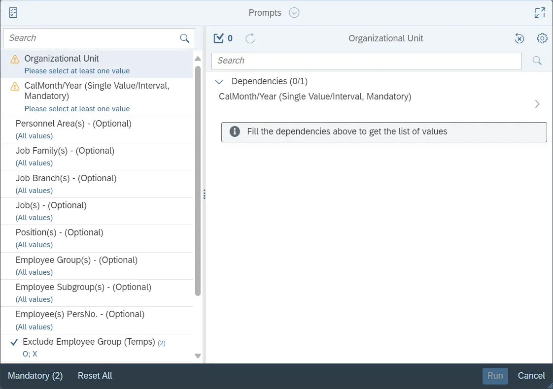 This report is generated after selecting values for the mandatory prompts. All mandatory prompts must have values selected before the Run Icon can be used to generate the report. Mandatory prompts can be identified as mandatory by the exclamation mark inside of the yellow-orange triangle, the square with the checkmark, or the display of (Mandatory). Detailed instructions for interaction with each prompt can be found on the Web Intelligence Prompt List on the OSC website.