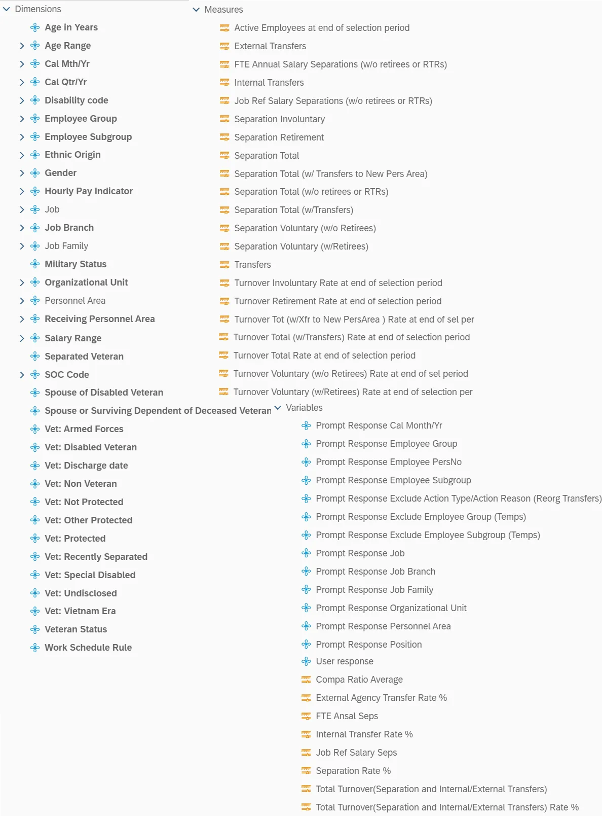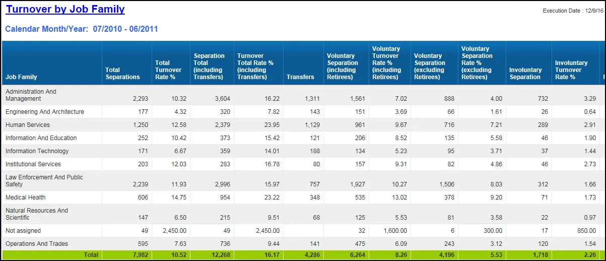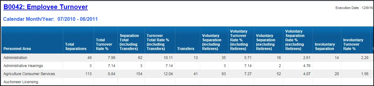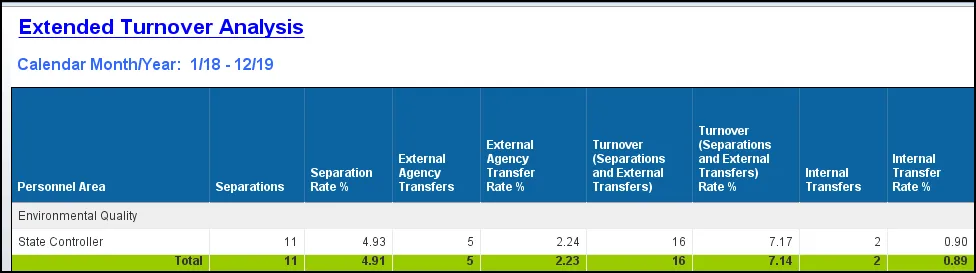 | Turnover (Separations and External Transfers) Rate % | (([Separations Total] + [External Agency Transfers]) / [Active Employees at end of selection period])) * 100 | |