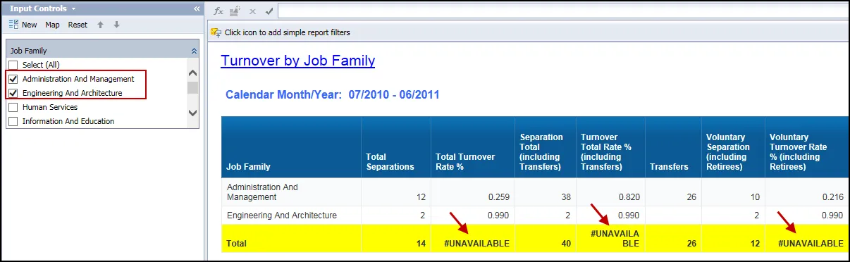 - Because of this setting, these calculations will result in the #UNAVAILABLE error if any type of local filter or Input Control utilizing more than one filter value is applied inside the report. This is a known bug within the tool. If possible, please utilize the Prompt screen to do any additional filtering desired.