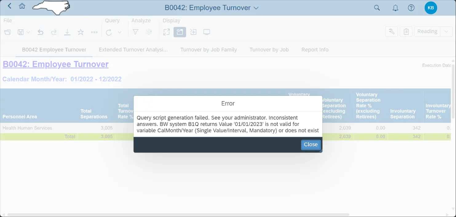 - If you want to match the headcount and turnover totals for this report with the totals on the “B0043-D: Turnover from State Government last 12 Months” Dashboard report, you will need to run this report with the following values in the prompts: