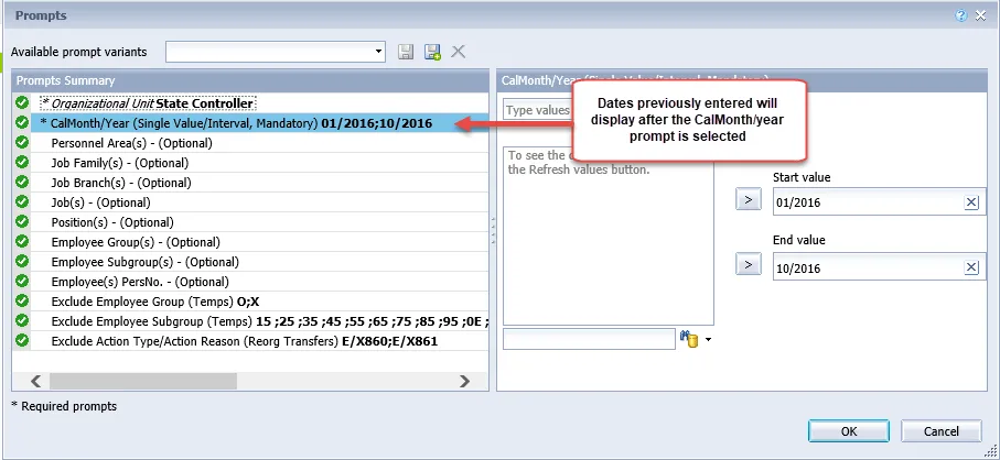 - After the CalMonth/Year prompt is selected, the dates entered will display from the previous report execution before the report was refreshed: