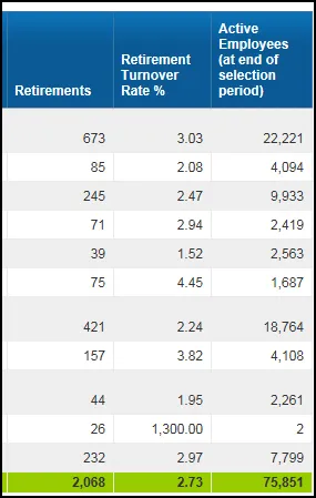 | Retirement Turnover Rate % | ([Retirements} / [Active Employees at end of selection period]) * 100 | |