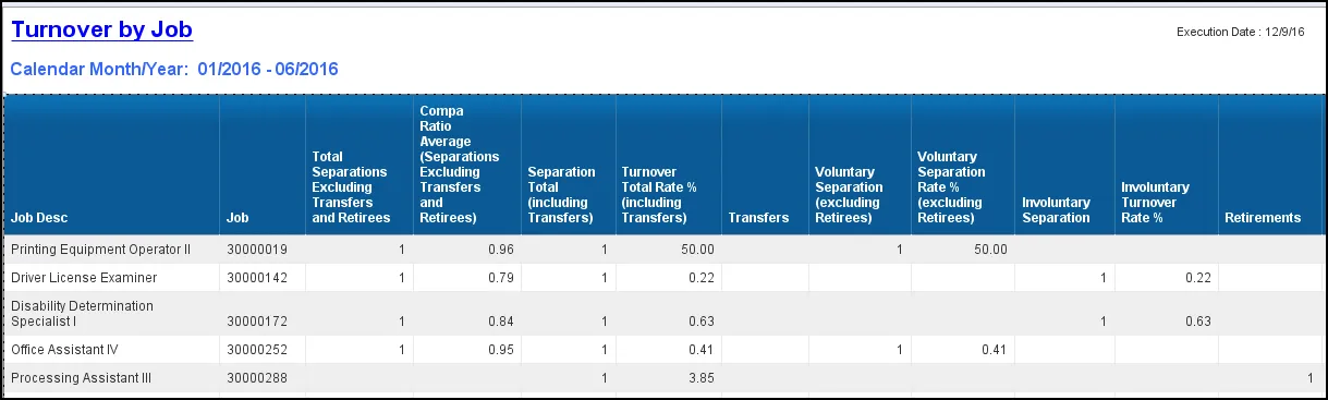 - The “Turnover by Job” report lists only jobs which had separated employees within the date range specified.