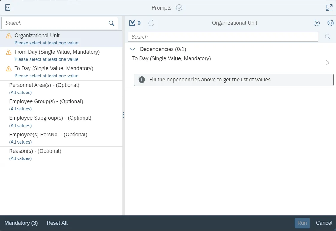 This report is generated after selecting values for the mandatory prompts. All mandatory prompts must have values selected before the Run Icon can be used to generate the report. Mandatory prompts can be identified as mandatory by the exclamation mark inside of the yellow-orange triangle, the square with the checkmark, or the display of (Mandatory). Detailed instructions for interaction with each prompt can be found on the Web Intelligence Prompt List on the OSC website.