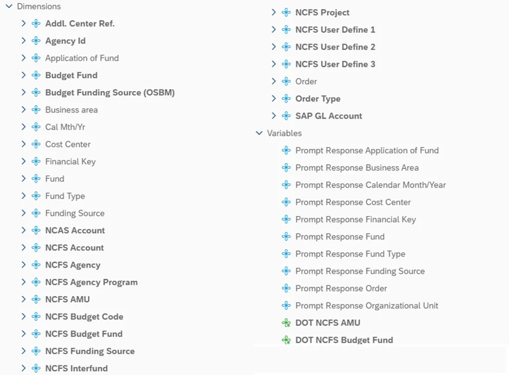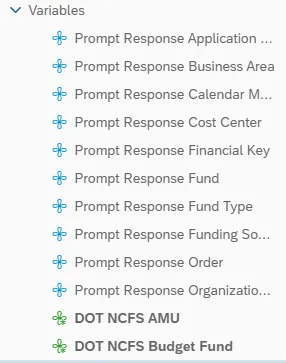 - NCDOT (NC02) specific fields DOT NCFS AMU and DOT NCFS Budget Fund are listed as BOBJ Variables in this report and are derived from NCDOT cost centers and Person Responsible (Addl Center Ref) values from SAP HR Payroll ERP system.