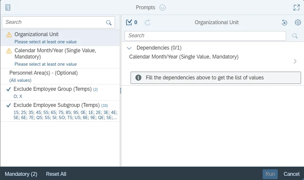 This report is generated after selecting values for the mandatory prompts. All mandatory prompts must have values selected before the Run Icon can be used to generate the report. Mandatory prompts can be identified as mandatory by the exclamation mark inside of the yellow-orange triangle, the square with the checkmark, or the display of (Mandatory). Detailed instructions for interaction with each prompt can be found on the Web Intelligence Prompt List on the OSC website.