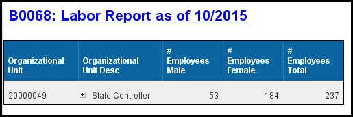 The B0068: Labor Report provides overall employee totals and totals by gender for employees who are active within the organizational unit and calendar month/year specified.