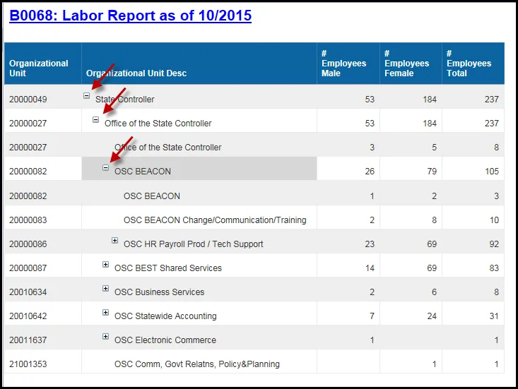 - The drill-down feature for the organizational unit is available on this report. You can click on the plus sign (+) to the left of the organizational unit description to drill down to view totals for organizational units within the higher-level organizational unit.