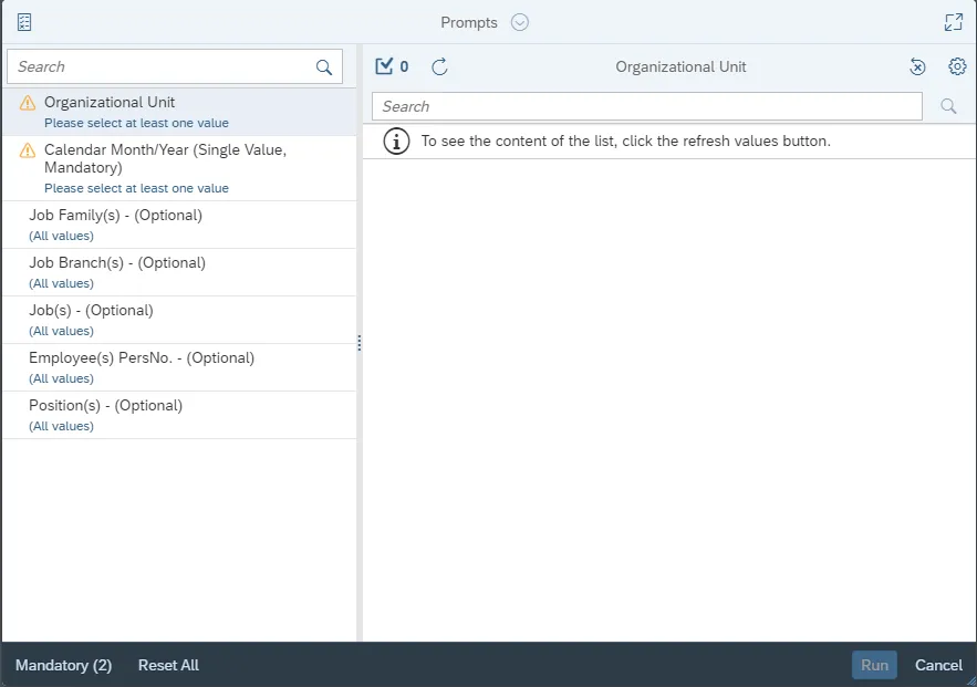 This report is generated after selecting values for the mandatory prompts. All mandatory prompts must have values selected before the Run Icon can be used to generate the report. Mandatory prompts can be identified as mandatory by the exclamation mark inside of the yellow-orange triangle, the square with the checkmark, or the display of (Mandatory). Detailed instructions for interaction with each prompt can be found on the Web Intelligence Prompt List on the OSC website.