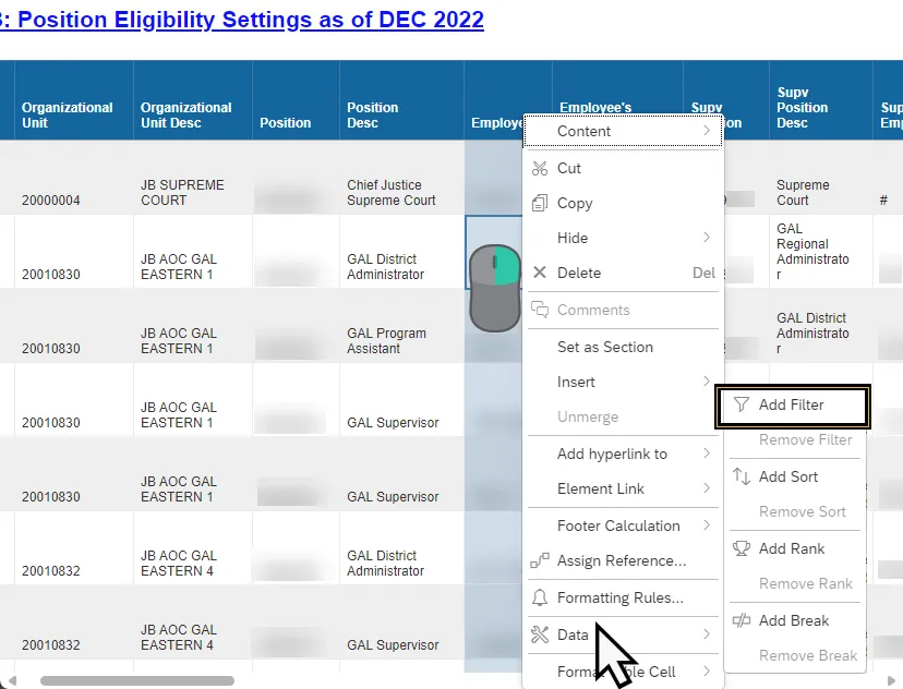 • There is a default filter applied to the report to exclude the Vacant Positions.  Vacant positions are indicated by Employee equal to #.  Filter is defined as Employee not equal to # to exclude vacancies. This filter can be changed if desired.