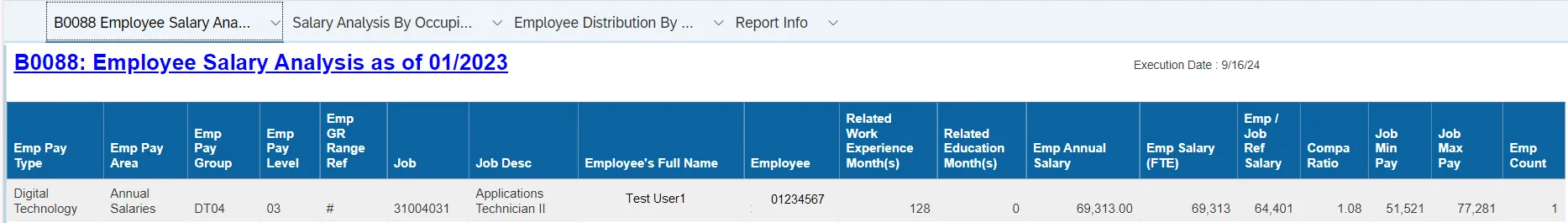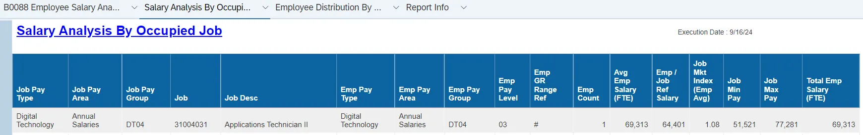 The purpose of this report is to display active employee salary analysis compared to banded or graded salary ranges in the Integrated HR-Payroll System.