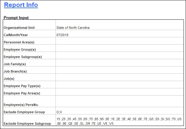 Report Info: displays the information about the prompts entered.