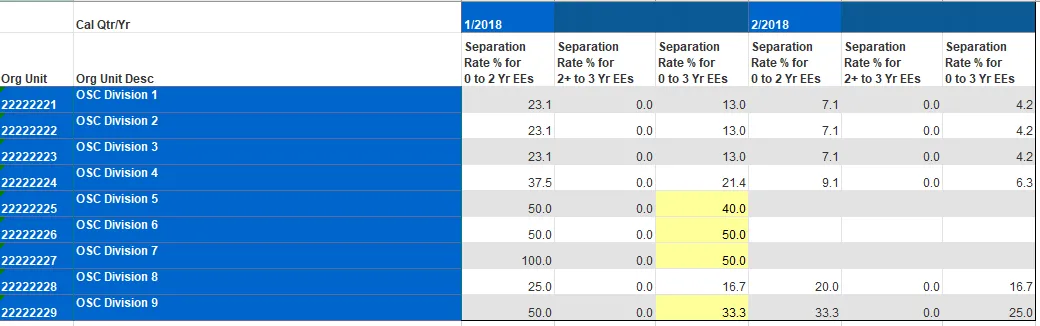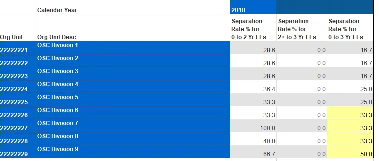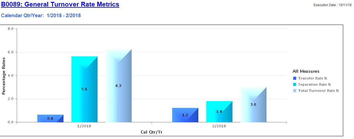This report identifies the turnover percentage rate and separation percentage rate by agency.  The report contains the following rate calculations: