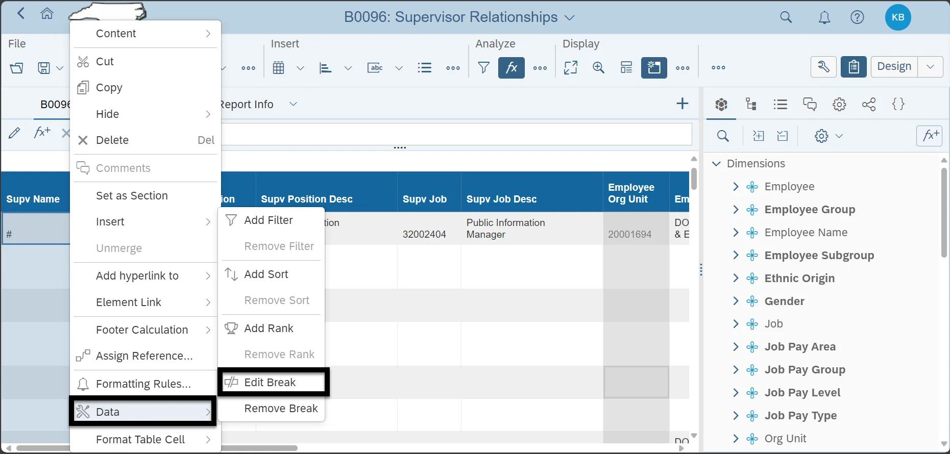 - The B0096 report was designed so row values are not duplicated on breaks when the report is first displayed. There are breaks on several objects on this report, so the repeating supervisor and organizational unit information will not be duplicated on each row. The following instructions will show how to repeat the values on each row of the report. Once the report is set up to repeat the values, you can then export the report to Excel, and the values will be repeated on the spreadsheet as well. There are 10 steps to complete this process.