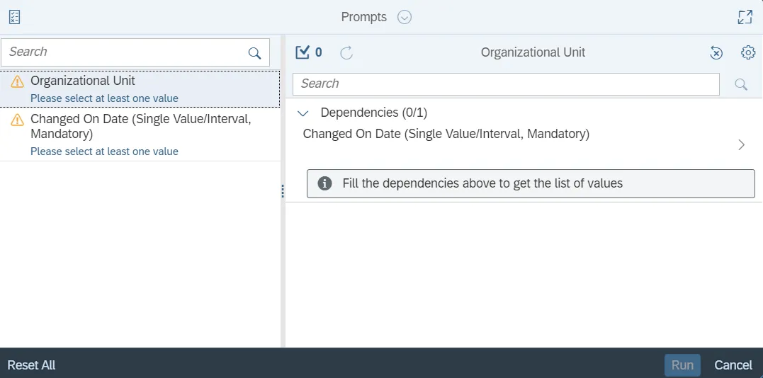 This report is generated after selecting values for the mandatory prompts. All mandatory prompts must have values selected before the Run Icon can be used to generate the report. Mandatory prompts can be identified as mandatory by the exclamation mark inside of the yellow-orange triangle, the square with the checkmark, or the display of (Mandatory). Detailed instructions for interaction with each prompt can be found on the Web Intelligence Prompt List on the OSC website.