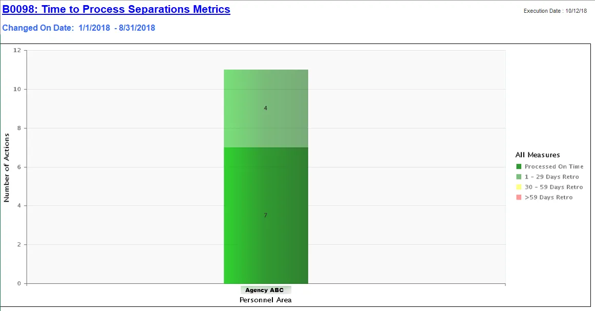 The B0098 Time to Process Separations Metrics report compares the effective date of the employee separation action to the date it was processed to determine whether the change was processed retroactively or not, and if so, by how many days.