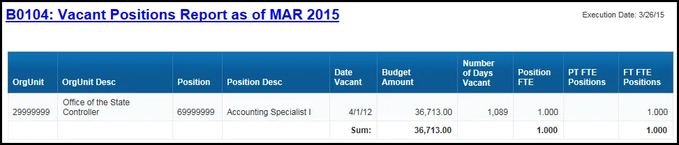 The report is generated with a list of vacant positions within the org unit selected. This is a sample row from the report, which shows the columns available on the base report: