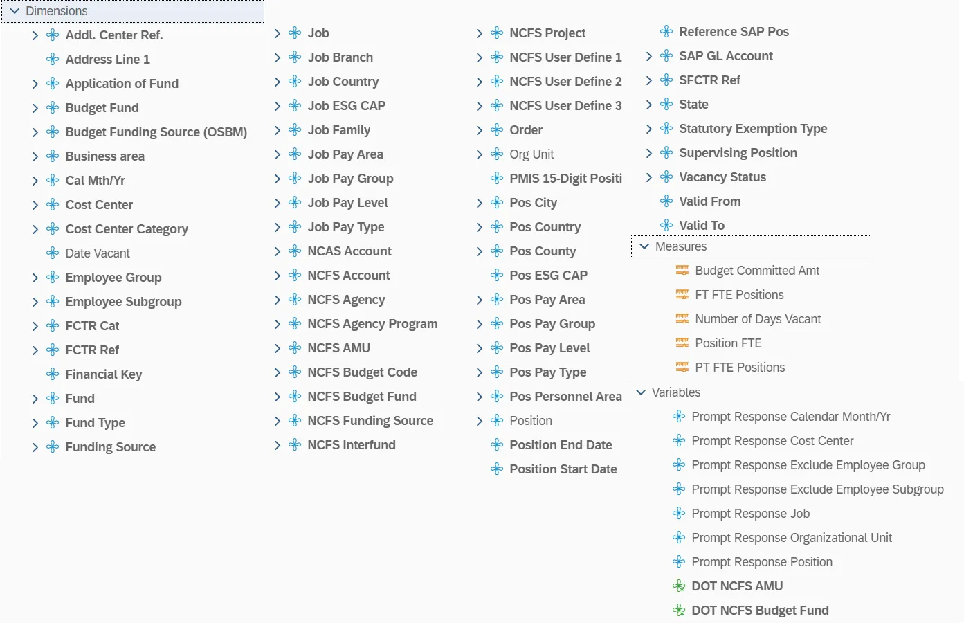 - NCFS Account and Budget Funding Source (OSBM) are available for reporting. Values are corresponding crosswalk to SAP GL Account and Funding Source in SAP HR Payroll system.