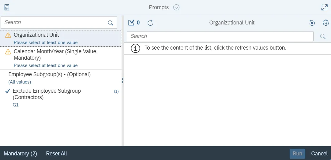 This report is generated after selecting values for the mandatory prompts. All mandatory prompts must have values selected before the Run Icon can be used to generate the report. Mandatory prompts can be identified as mandatory by the exclamation mark inside of the yellow-orange triangle, the square with the checkmark, or the display of (Mandatory). Detailed instructions for interaction with each prompt can be found on the Web Intelligence Prompt List on the OSC website.